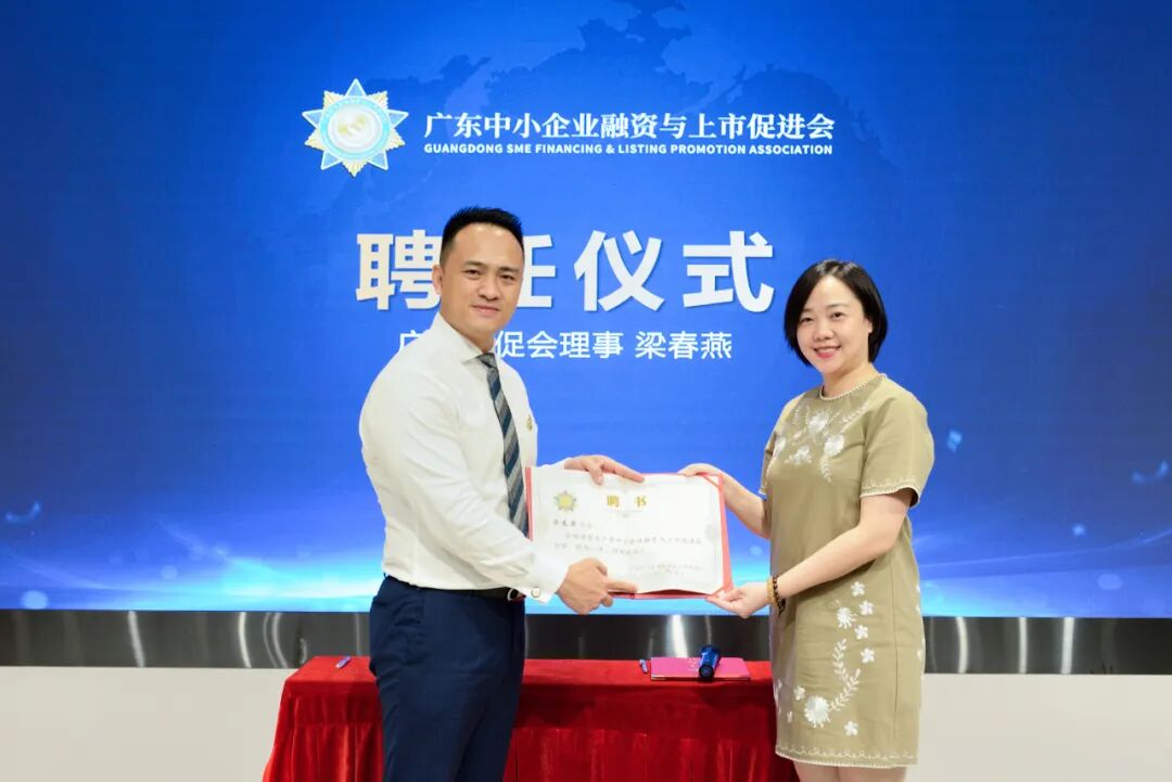 ▲ 中国平安家庭财富风险管理顾问、国际龙奖(I D A)获奖会员梁春燕女士入会担任广东融促会理事,龙锦强会长亲自为其颁发聘书。
